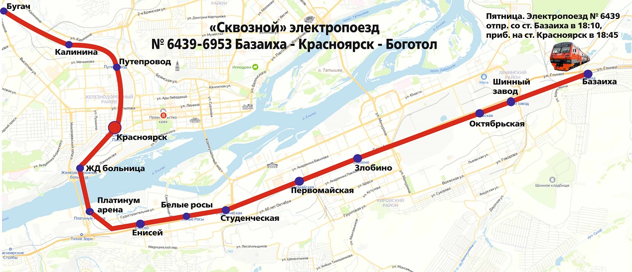 Маршрут (электропоезд + автобус) из Красноярска в Мариинск и Томск.
