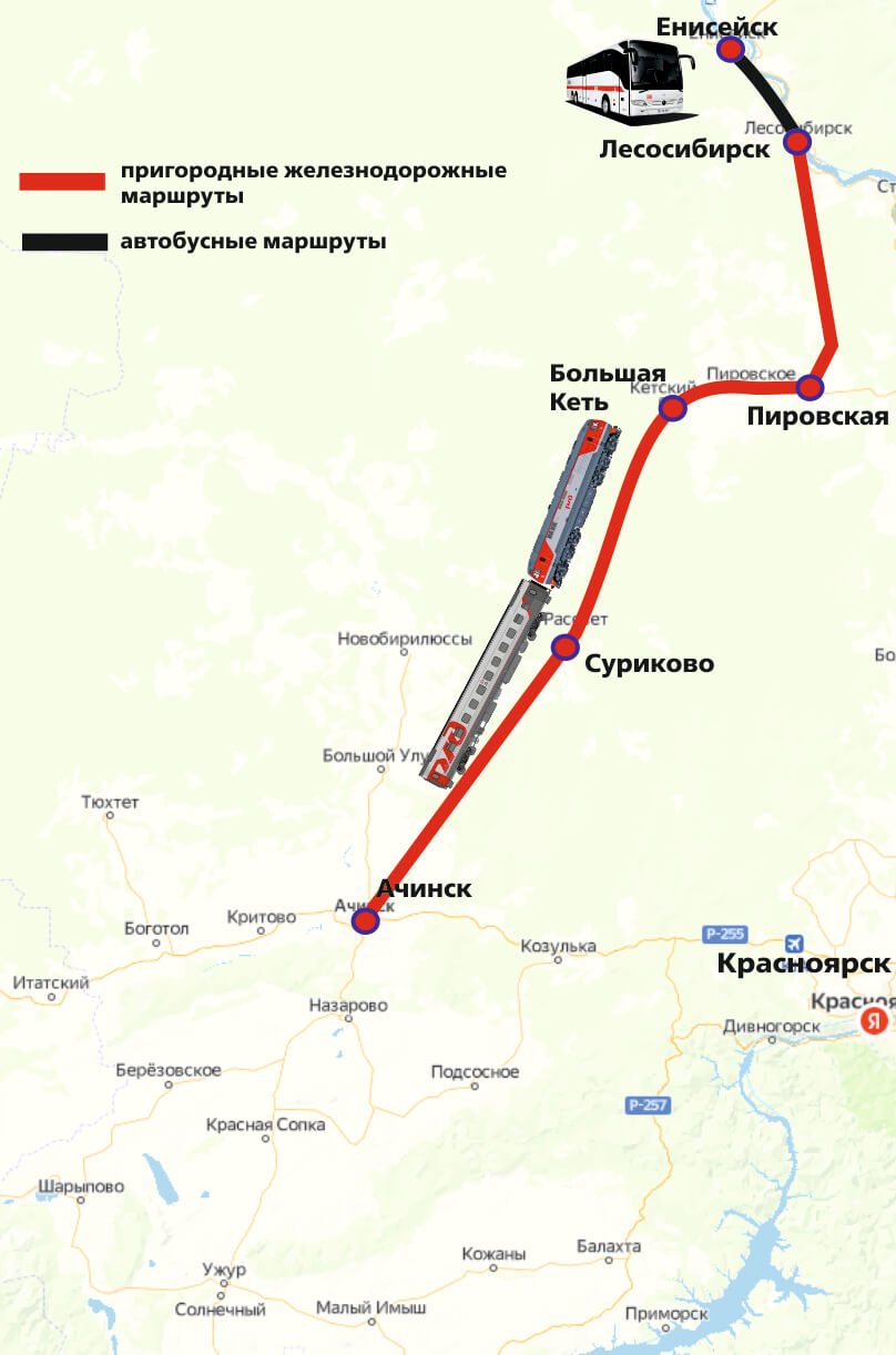 Дополнительно пассажиры могут совершать поездки пригородными поездами, курсирующими на участке Ачинск-1 - Лесосибирск, с пересадкой на ст. Ачинск-1 в междугородние автобусы для проезда до краевого центра, а также в обратном направлении.