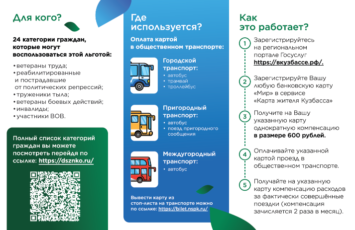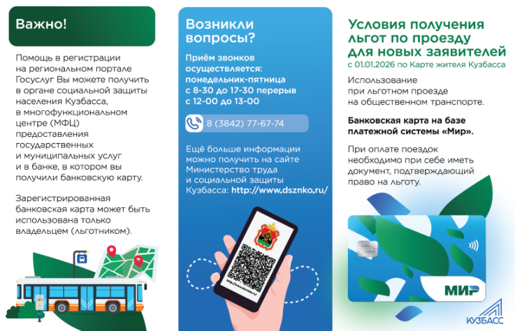 Граждане, которые получат право на льготный проезд с 1 января 2026 года, будут осуществлять проезд с помощью сервиса «Карта жителя Кузбасса». С порядком получения льготы на проезд по Карте жителя можно ознакомиться ниже: