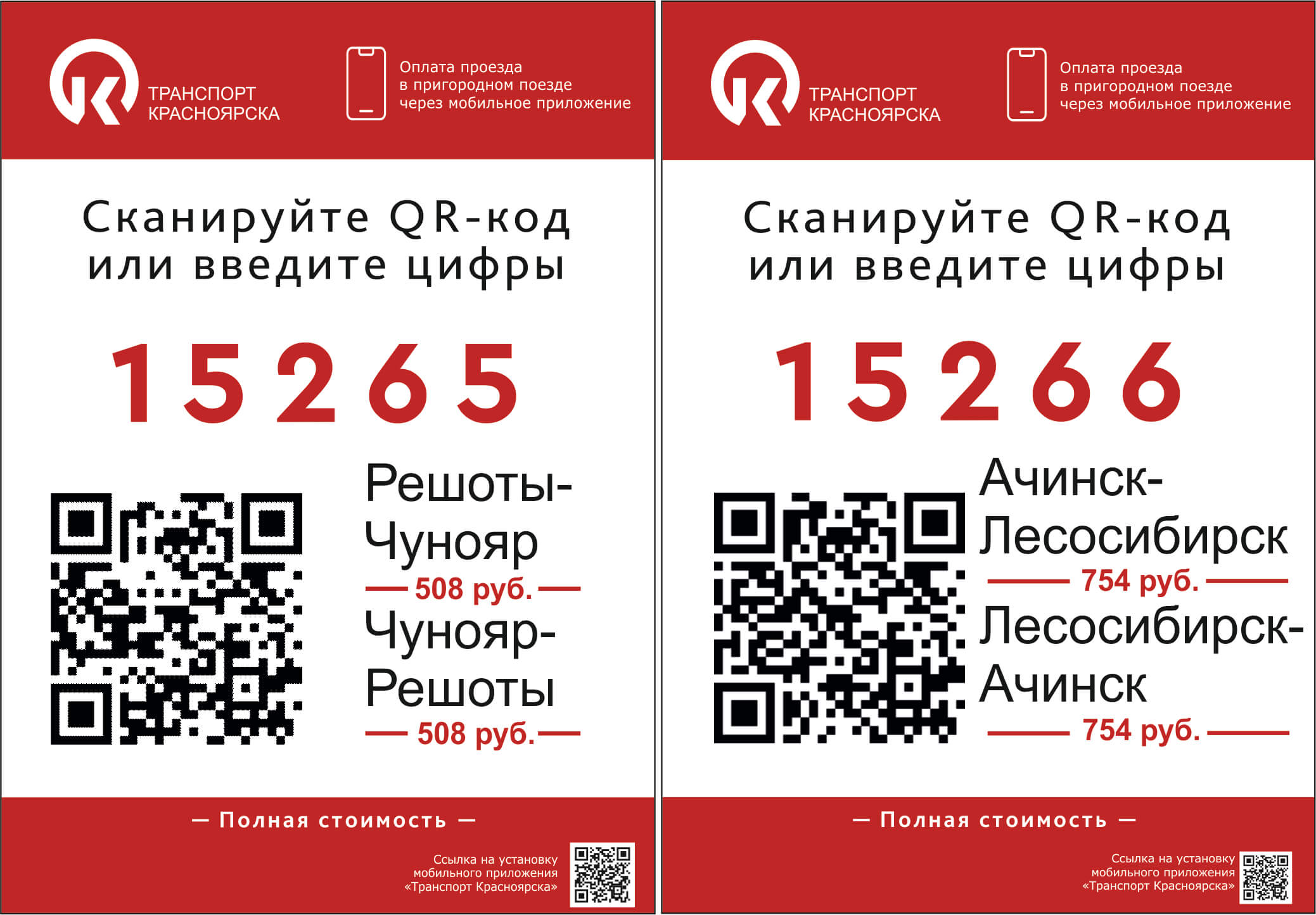 Для приобретения электронного билета на поезд пригородного сообщения потенциальный пользователь должен на свое мобильное устройство установить приложение «Транспорт Красноярска» и зарегистрироваться в нем. Ссылка на установку мобильного приложения для устройств на базе Android размещена на информационной наклейке «Транспорт Красноярска», имеющейся в вагонах пригородных поездов Ачинск-Лесосибирск и Решоты-Чунояр, а также в при кассовых зонах вокзалов Ачинск-1, Лесосибирск, Решоты (Северные), Чунояр (наклейки прилагаются).