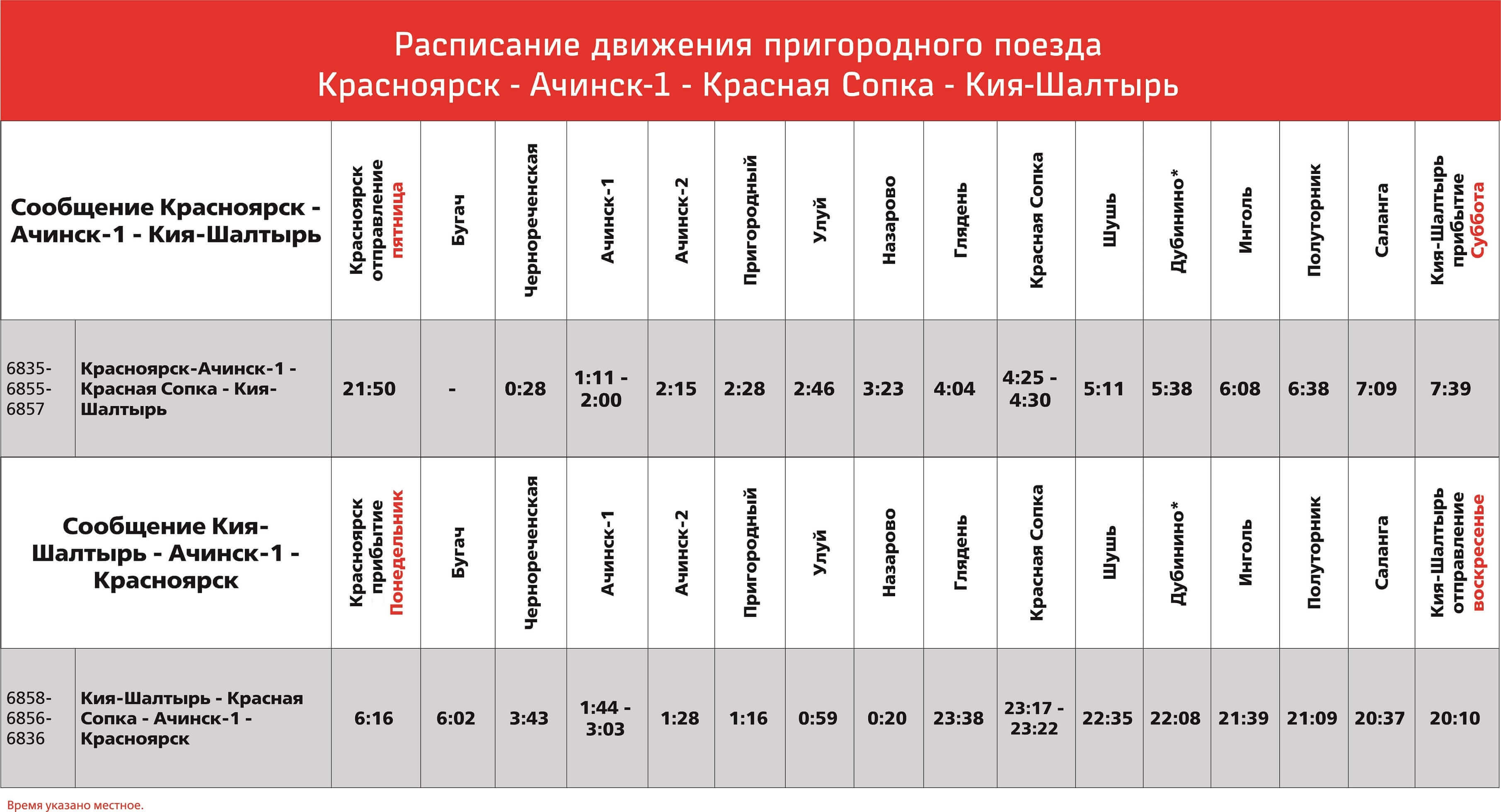 Время отправления пригородного поезда Кия-Шалтырь - Красноярск от станции Кия-Шалтырь по воскресеньям в 20:10,