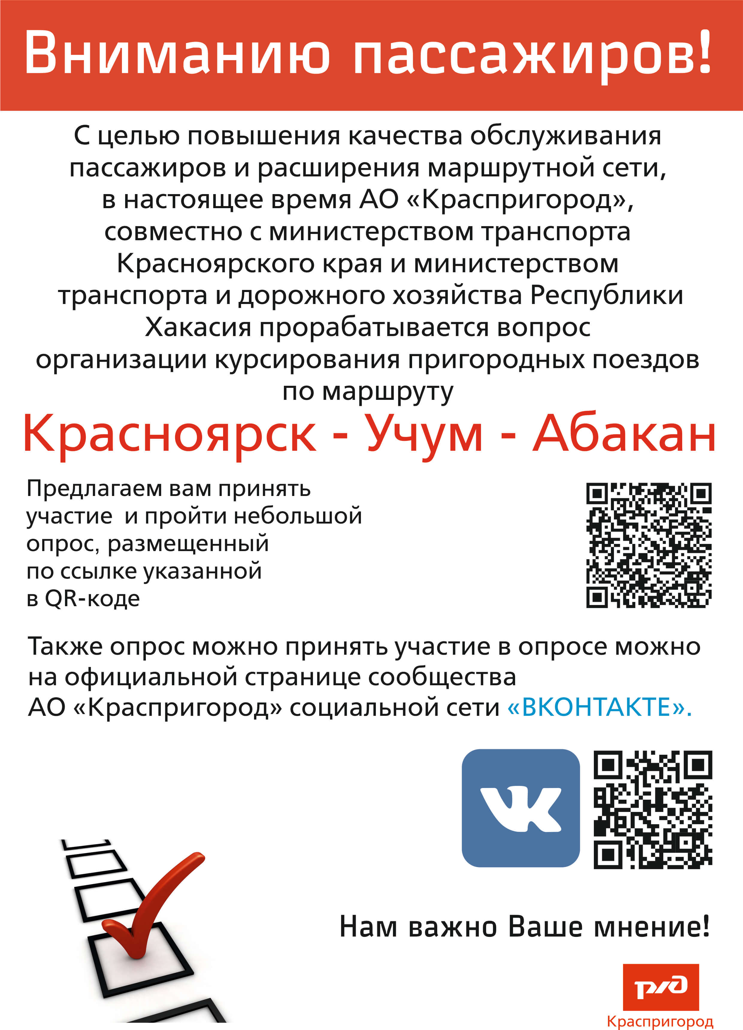 С целью определения потребности населения в пригородных перевозках на данном маршруте, периодичности и времени курсирования пригородных поездов, АО «Краспригород» с 25 декабря 2023 года по 15 января 2024 года на официальной странице сообщества «АО «Краспригород» в социальной сети «ВКОНТАКТЕ», а также в сервисе «Яндекс.формы» (по QR-коду, размещенному на информационной афише) проводит социологический опрос.